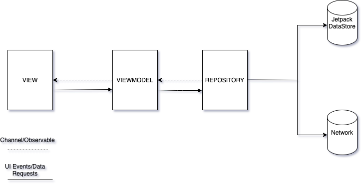 The ViewModel may provide a stream of events to which the View may subscribe to and take some action. It retrieves data from the Model layer, applies logic and exposes what it needs for the View. These exposures are happening via Channels, essentially Observables for Kotlin Corroutines.