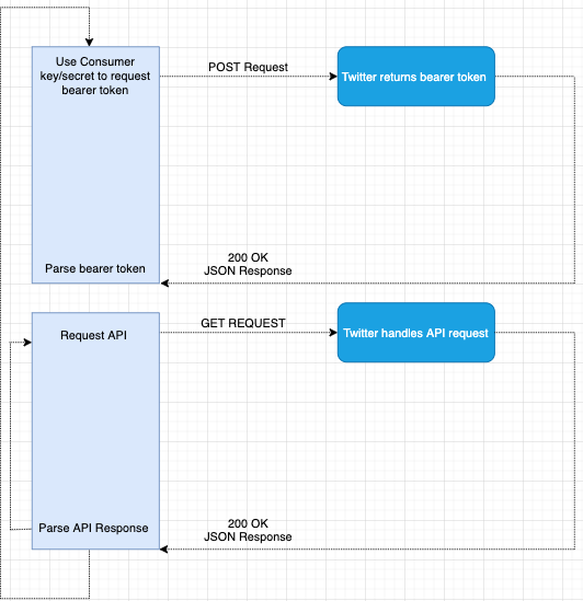 With Application-Only Authentication and OAuth2.0 Bearer Token, which is used here, we are able to create a signature for the application itself. Typically used for instances that need read-only access to public information. This obviously limits the functionality of some endpoints for us since there is no concept of a “current user”, for example, a twitter user will not be able to use this application to take actions pertaining to their twitter account such as posting tweets or making profile changes.