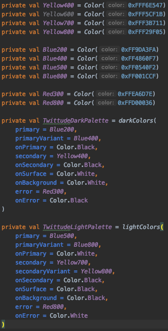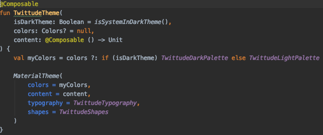 Keep in mind this is all specified in our Theme class, making support for dark theme easier as seen in our Theme composable.