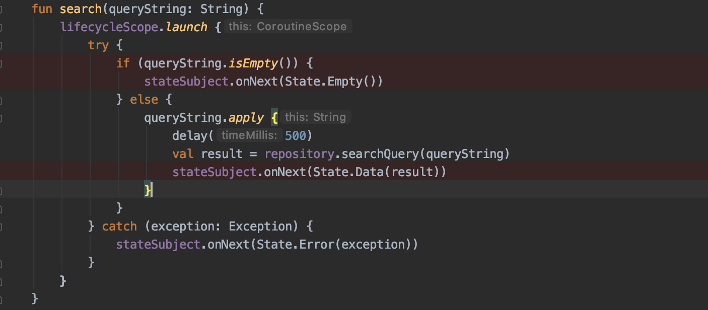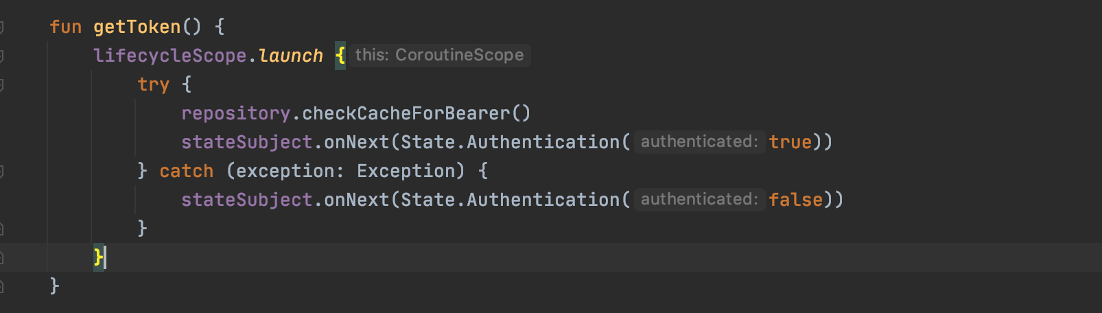 Notice that the function declaration does not contain suspend. This is because the lifecycleScope of the viewmodel is suspending.