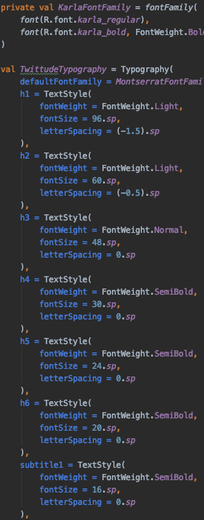 By defining a custom type system, you can continue to create a feel and look that best represents your product. Starting with defining a fontFamily containing a list of custom font files(.ttf), which are store in your res/font directory; you can take control of regular/bold/semi-bold/etc.. fonts giving you complete control.