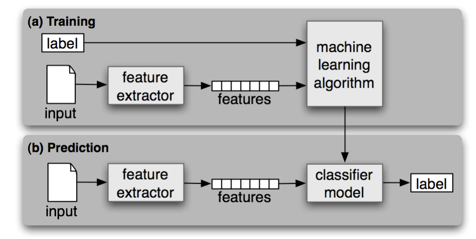 The work flow for this task will follow the shown framework. Taking our training set, a feature extractor converts each item into a feature set. These feature sets along with each input item’s label are put into our ML Algorithm to develop a model. During the prediction phase, the same feature extractor is used to convert the test set inputs into feture sets, these feature sets will have a label of Null or None. They are then put into the model which generates predicted labels to replace the Null or None